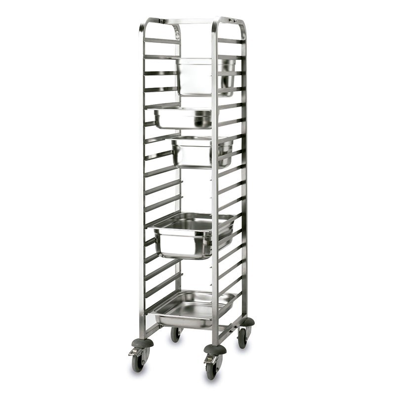 Este carro portabandejas o portacubetas vertical, está fabricado en acero inoxidable 18/10 de alta calidad que ofrece una garantía máxima en cuanto a resistencia, durabilidad e higiene, y es especialmente útil para uso profesional en servicios de cocina, hostelería, restauración, comedores, buffets y grandes celebraciones y eventos.