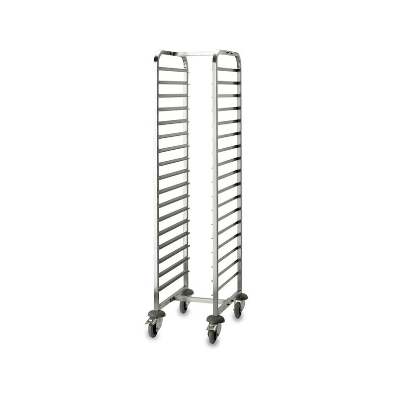 Carro portabandejas vertical con ruedas, de 172 cm de alto, y fabricado en acero inoxidable 18/10 de alta calidad y excelente resistencia a la corrosión. Disponible en varias medidas.