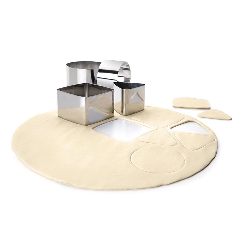Set de 4 aros con formas variadas, 2 redondos, 1 cuadrado y 1 triangular. Ideales para trabajos de repostería y corte de masas.